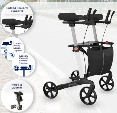 This Forearm Seat Walker is equipped with forearm supports that are height, depth and angle adjustable, the user can achieve optimal centre of gravity for improved balance and weight distribution.